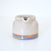 全体的に落ち着いた色合いですが、ポイントにココア色のライン、そして何色とも言えない不思議なグラデーションの釉薬に魅せられます