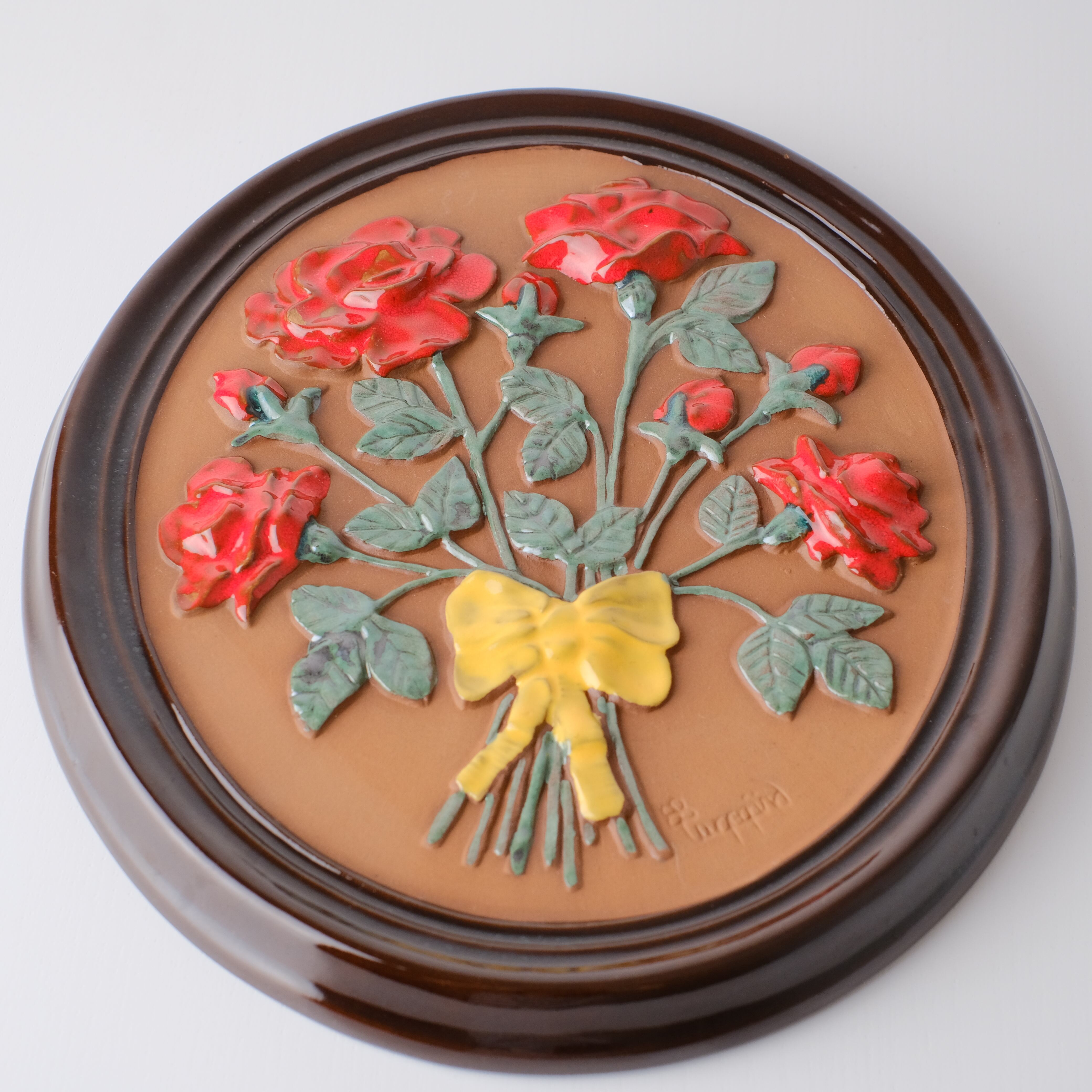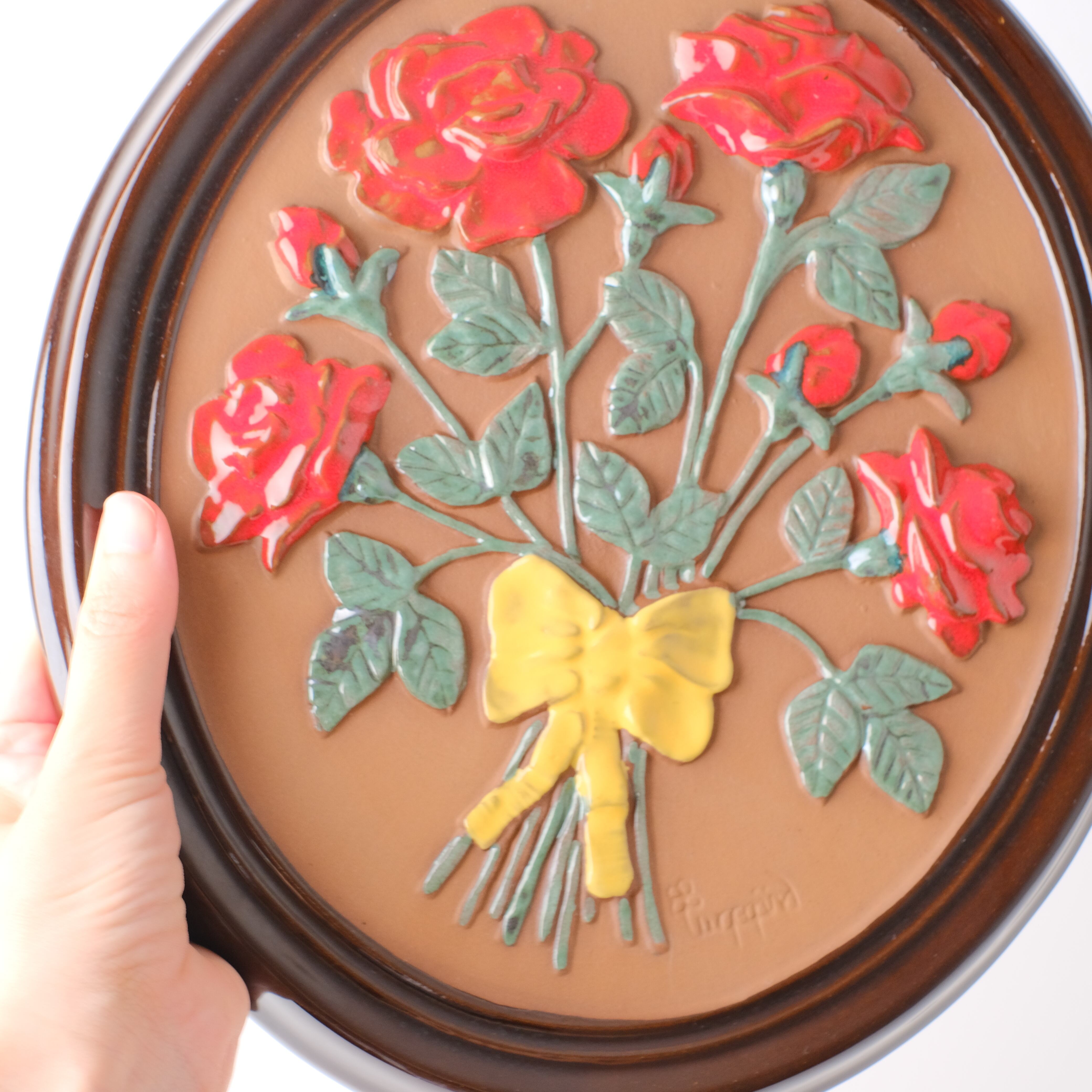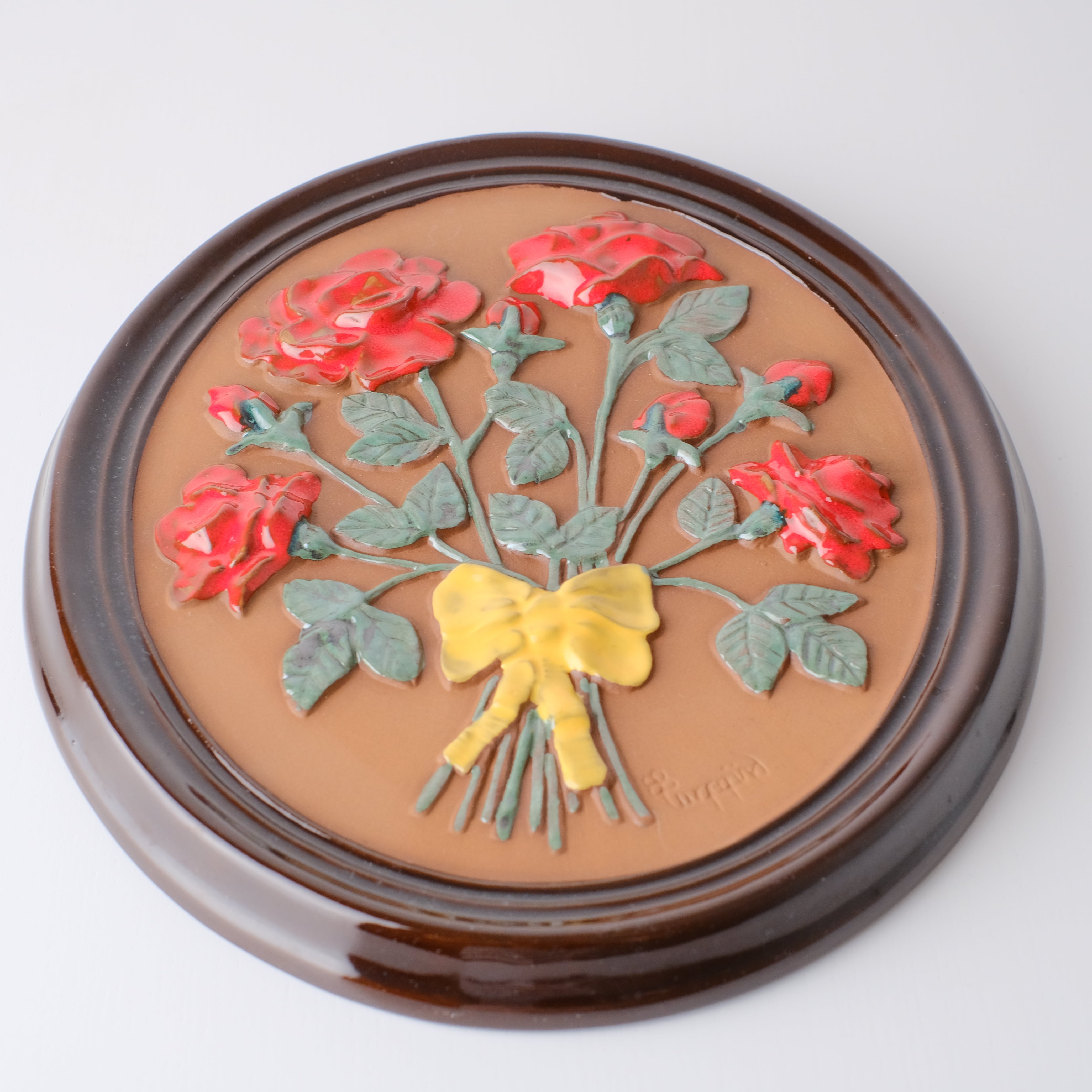こちらは大きなサイズで、バラの花束の陶版です。赤い薔薇に黄色のリボンがなんともキュート